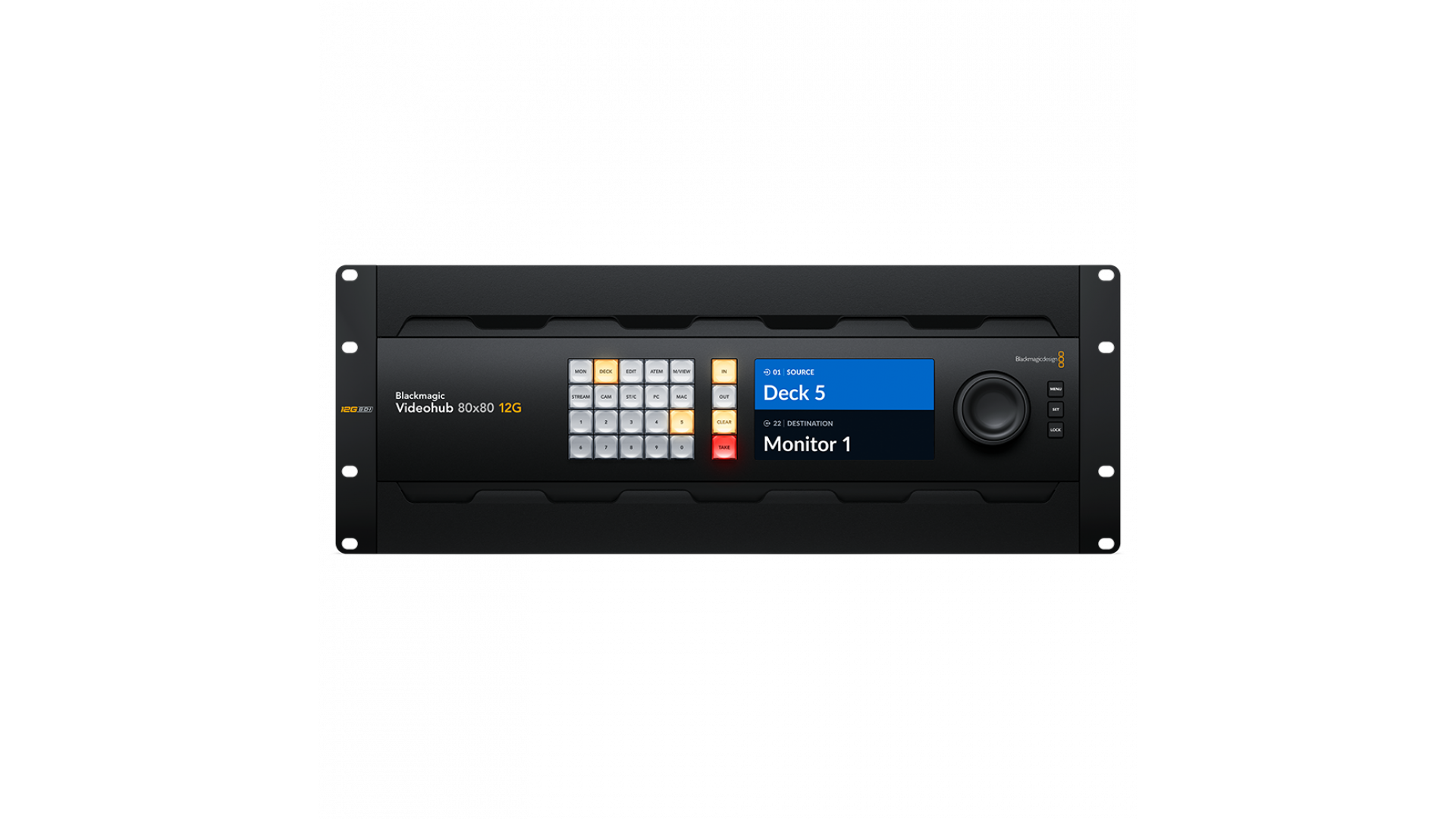 Blackmagic Videohub 80x80 12G е усъвършенстван видео рутер с нулева латентност, който поддържа всяка комбинация от SD, HD и Ultra HD на видео сигнали едновременно. 80-те 12G-SDI входа разполагат със светодиоди на всеко BNC, които показват присъствието на SDI сигнал,както и наличието на 80 12G-SDI изхода, резервирано захранване и синхронизиращи Tri-Sync/ Black Burst вход и всичко това в компактно 4U/19" шаси . Големият Full HD LCD екран ви позволява да видите видео преди комутация и ясно показва имената за комутация и видео стандарта. Комутацията може да се извърши чрез директен избор на бутон и използване на голямо ротационен бутон. Рутерът също така разполага с SDI re-clocking, външен Ethernet контрол и поддържа всички SDI видео стандарти до 2160p60.