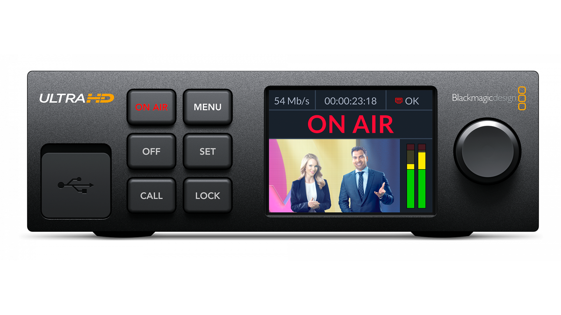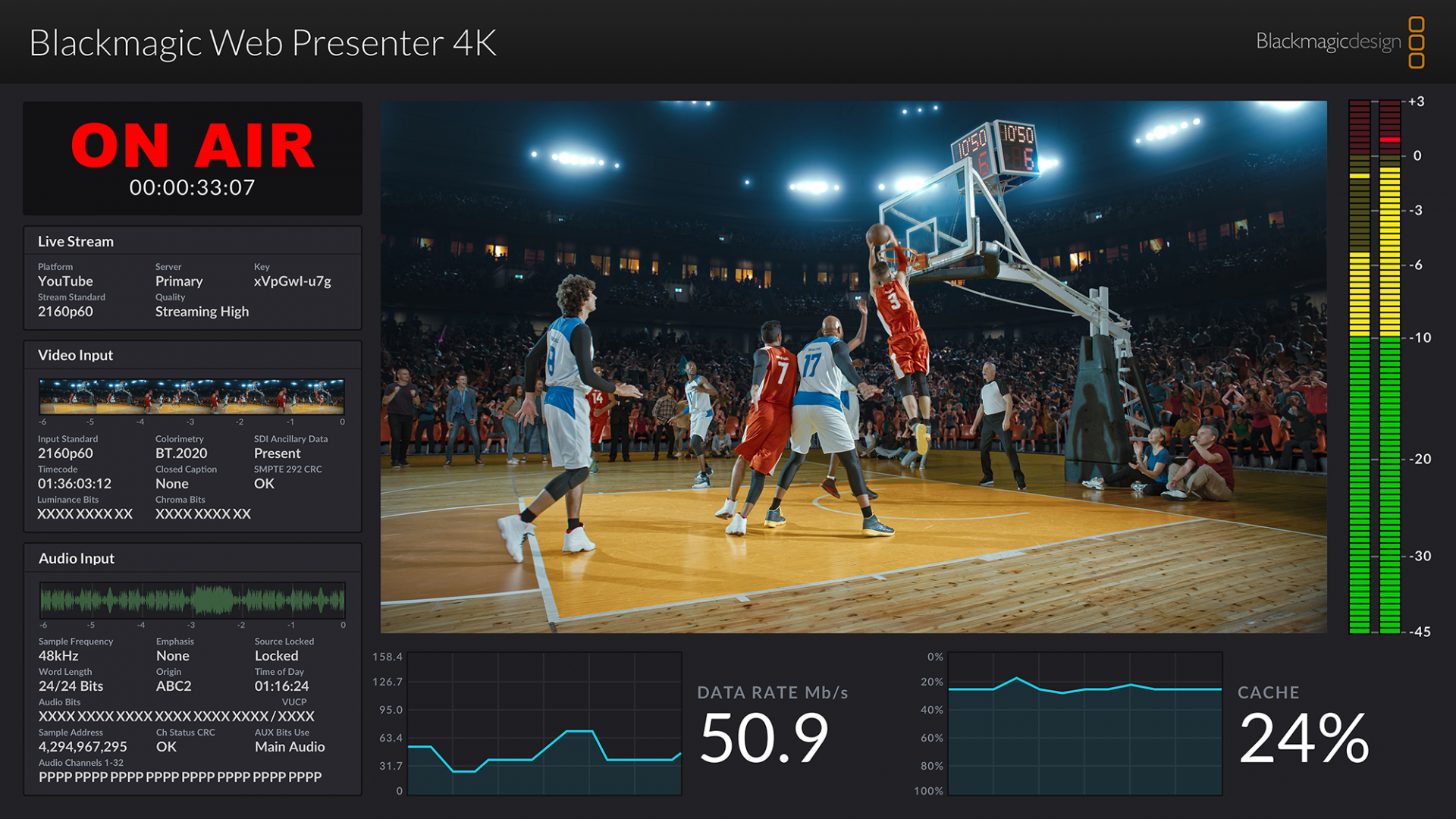 Blackmagic Web Presenter 4K е най-доброто решение за стрийминг за HD и Ultra HD. Той е оборудван с професионален хардуерен стрийминг двигател за поточно предаване до 2160p/60 директно към YouTube, Facebook, Twitter и други платформи. Освен това имате избор да предавате поточно към интернет през Ethernet или да използвате мобилни данни чрез свързан 5G или 4G мобилен телефон. Тъй като вградените USB портове работят като уеб камера, можете да свържете компютър и да използвате всеки видео софтуер. Има дори изход за наблюдение на видео изображения, измерватели на нивото на звука, графики на тенденциите и др.