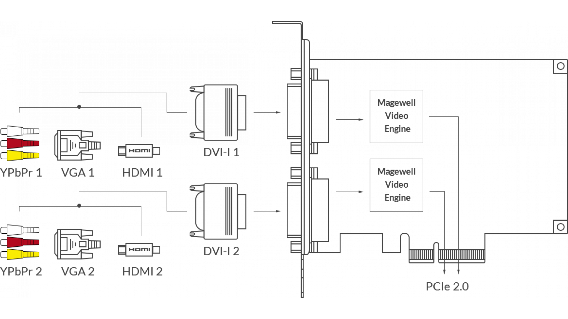 Тагове: Dual DVI capture card, Magewell dual DVI video capture, low latency DVI input, professional video processing, PCIe dual DVI capture card