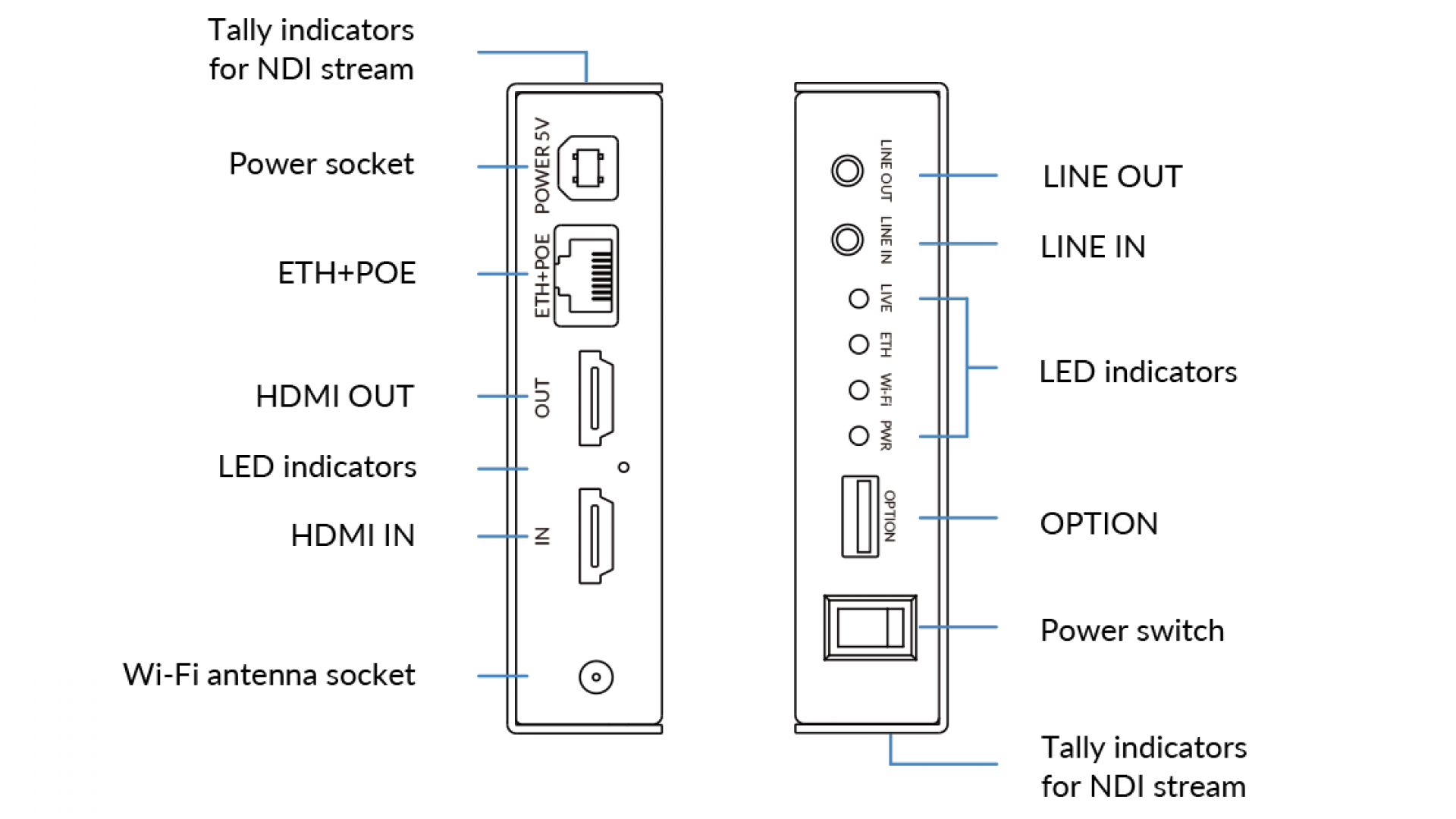 - Поддържани стрийминг протоколи: RTSP, RTMP, RTMPS, SRT Caller/Listener, NDI® HX2, NDI® HX3, HLS, TS over UDP, TS over RTP, TVU ISSP