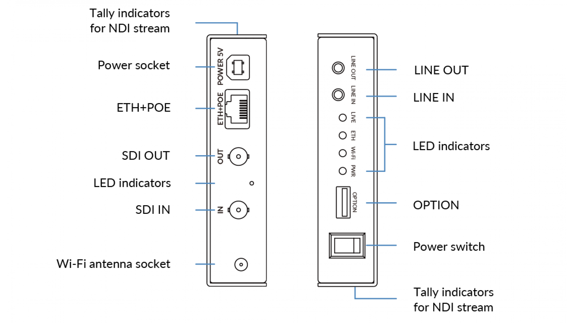 - Поддържани стрийминг протоколи: RTSP, RTMP, RTMPS, SRT Caller/Listener, NDI® HX2, NDI® HX3, HLS, TS over UDP, TS over RTP, TVU ISSP