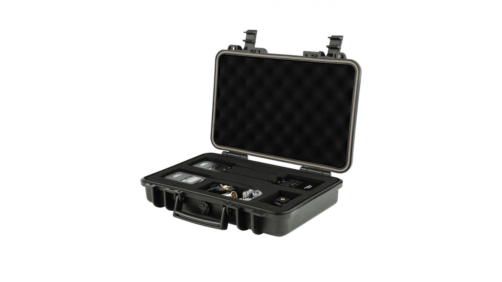 Next, attach the included lavalier microphones to the two transmitters and clip them onto the subjects. Use any of the three included adapters to attach the receiver to the camera, speaker, mixer or recorder that will be receiving the signal. For real-time audio monitoring, headphones can be inserted into the receiver, next to the Line Out port. Take a test sample of the audio and begin recording! When you are done, the entire kit and all of its accessories fit neatly into the included hard case.