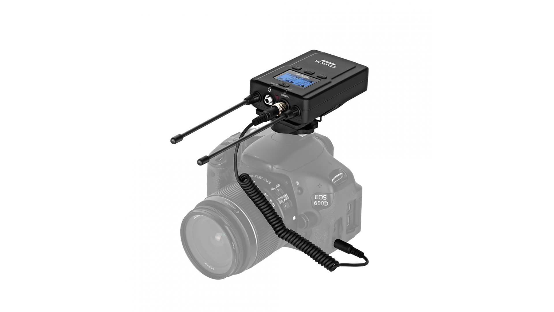 The CVM-WM200C is a single-transmitter and receiver wireless microphone kit from Comica. This kit runs on AA batteries (not included) and has a maximum range of 120m. To begin using this kit, take out the transmitters and receiver and install 2 AA batteries in each unit. On the transmitters, use the large switch on the side to designate which unit is the A unit and which is the B. Then, you can either assign each a channel manually or use the IR search function to allow the transmitters and receiver to identify which channel has the least amount of interference and automatically assign themselves to that channel. Attach each unit to the user via belt clip, camera cold shoe mount or an accessory arm via the 1/4-20 mount on the back.